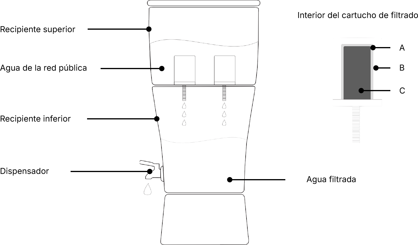 3. Suministro de agua. El agua filtrada se deposita en el recipiente inferior, de donde se obtiene el agua a través de la llave.