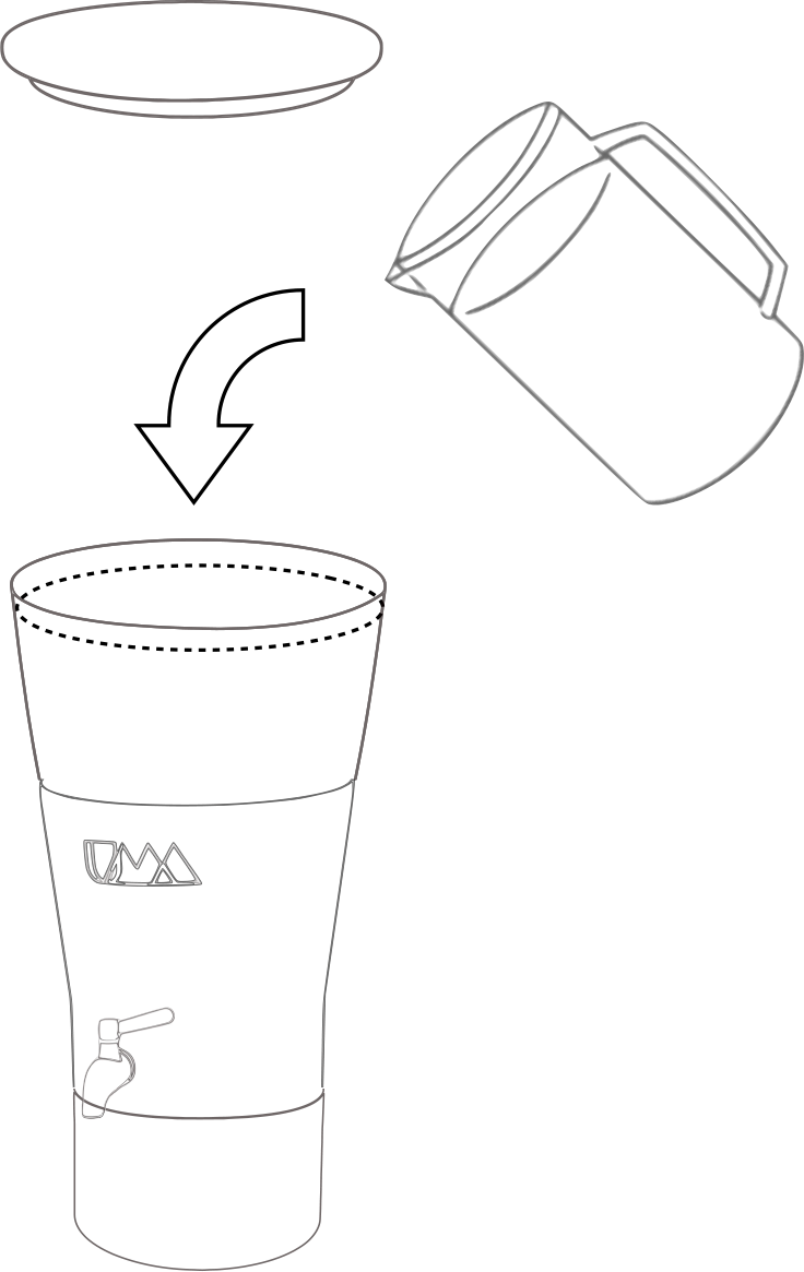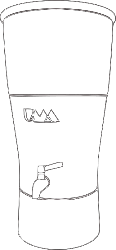 Llena el recipiente superior con agua de la llave utilizando una jarra y espera a que se filtre al recipiente inferior. El Sistema de Purificación de Agua UMA filtra aproximadamente 2.4 l por hora.