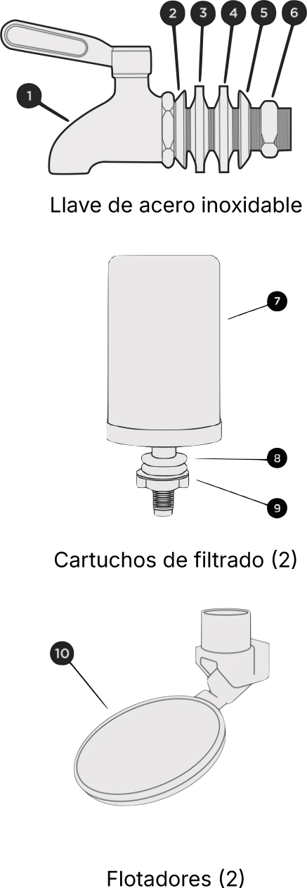 Si los cartuchos y flotadores están bien instalados y el agua se sigue derramando, es posible que un flotador tenga algún defecto o se haya dañado al instalarlo. En ese caso habría que sustituirlo. Contáctanos en hola@umafiltros.com para poder enviarte un reemplazo. (Con costo a menos de que se trate de un defecto de fábrica).